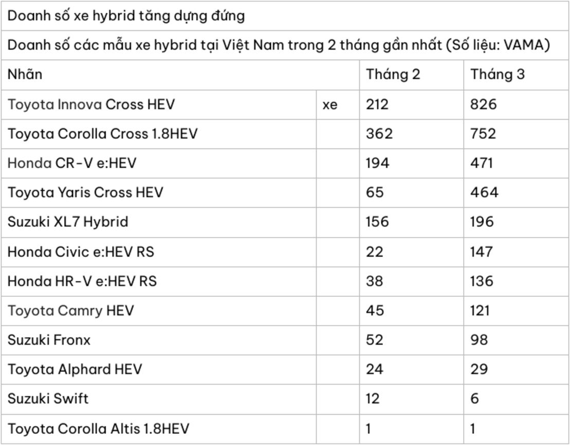 Con số này đánh dấu mức tăng trưởng đáng kể so với 1.040 xe bán ra trong tháng 1 và 1.183 xe trong tháng 2. Đây cũng là tổng doanh số cao nhất mà phân khúc xe hybrid đạt được kể từ đầu năm 2024.