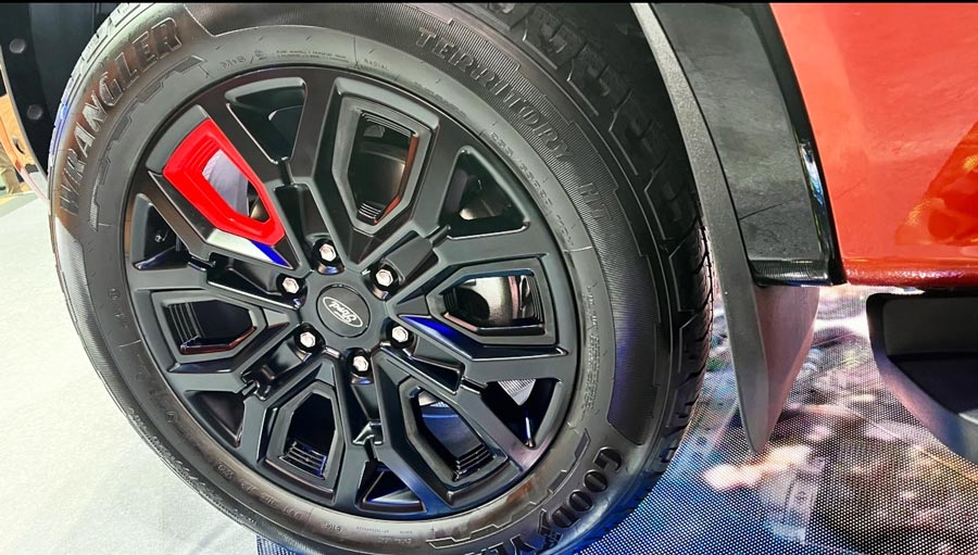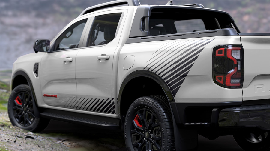 Ford Ranger Stormtrak được trang bị lưới tản nhiệt mới, đèn tích hợp gọn gàng bên trong, cùng bộ vành hợp kim 20 inch đặc trưng với chi tiết màu đỏ nổi bật. Xe còn đi kèm với decal sọc chéo hai bên thân, tạo nên diện mạo độc đáo và sang trọng.