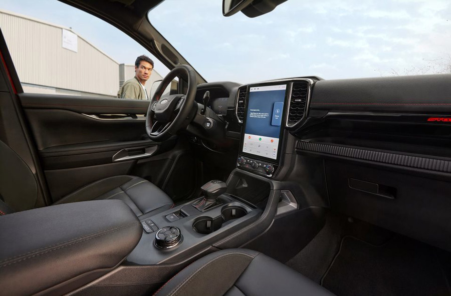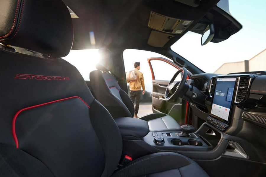 Bên trong, Ford Ranger Stormtrak mang đến không gian nội thất sang trọng với ghế bọc da hai tông màu đen đỏ, kết hợp những đường chỉ đỏ tương phản và tựa lưng thêu chữ “Stormtrak”.