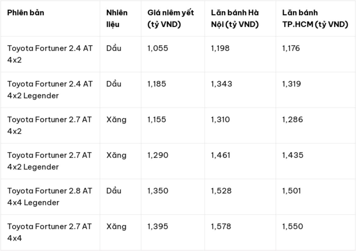 Vào tháng 4/2026, Toyota Việt Nam đã tiến hành cập nhật bảng giá niêm yết cho các phiên bản Toyota Fortuner 2026, đặc biệt tập trung vào những cấu hình trang bị hộp số tự động (AT). Dưới đây là thông tin chi tiết về giá niêm yết và mức giá lăn bánh ước tính tại các khu vực khác nhau, giúp khách hàng có cái nhìn tổng quan về chi phí sở hữu.