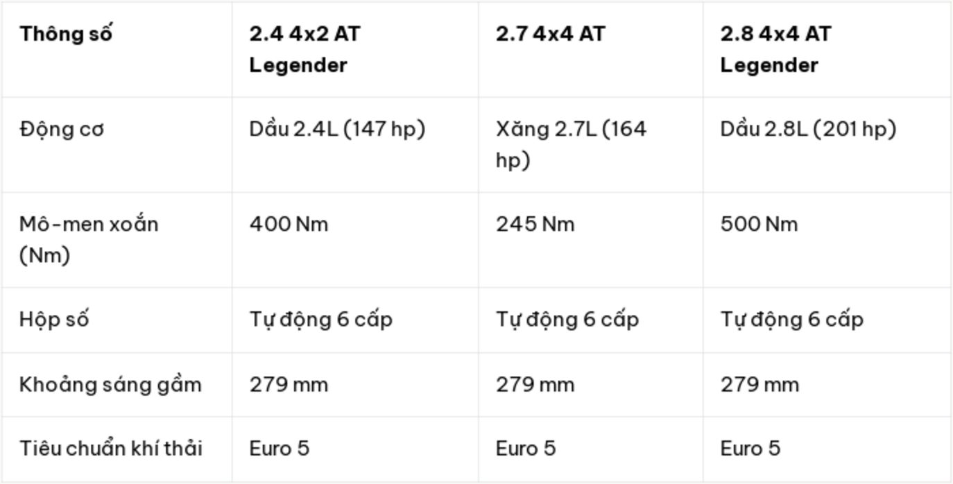 Để đáp ứng nhu cầu đa dạng của người dùng và tuân thủ các tiêu chuẩn khí thải ngày càng khắt khe, Toyota Fortuner 2026 mang đến sự lựa chọn linh hoạt với ba cấu hình động cơ khác nhau. Mỗi cấu hình đều được tinh chỉnh để tối ưu hiệu suất và đảm bảo vận hành bền bỉ, mạnh mẽ trên mọi hành trình.