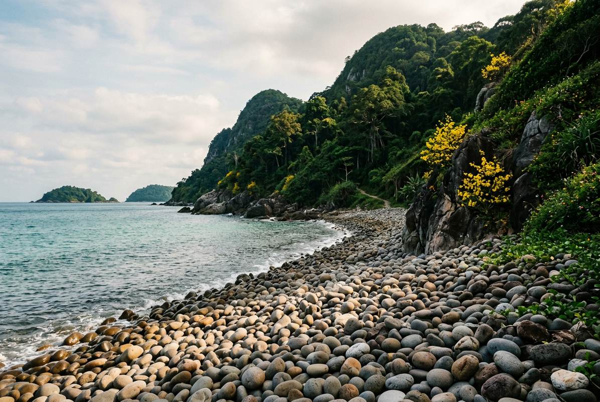 Dường như được thiên nhiên ưu ái ban tặng, Hòn Khoai vẫn giữ trọn vẹn nét hoang dã nguyên bản với những đồi núi trập trùng, rừng cây bạt ngàn cùng vô số loài gỗ quý hiếm. Khác biệt với những bãi biển cát trắng mịn màng quen thuộc, nơi đây níu chân du khách bởi những bờ biển trải dài đầy đá cuội tròn vo như trứng ngỗng, tạo nên một cảnh sắc độc đáo đến mê hoặc.
