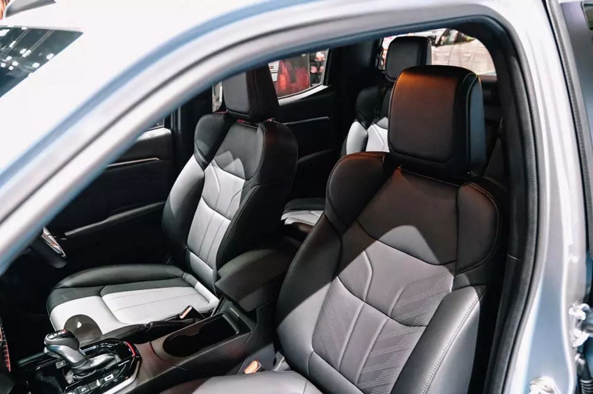Bên trong khoang lái, Isuzu D-Max EV mang đến một không gian nội thất tiện nghi và hiện đại, kế thừa nhiều chi tiết từ bản máy dầu. Ghế ngồi được bọc da cao cấp, trong đó ghế lái có thể chỉnh điện 8 hướng, còn ghế phụ lái chỉnh tay 6 hướng, đảm bảo tư thế ngồi thoải mái cho người sử dụng. Hàng ghế sau có khả năng gập theo tỷ lệ 60:40 và tích hợp bệ tì tay tiện lợi. Vô lăng được bọc da, có thể chỉnh 4 hướng, tạo cảm giác cầm nắm chắc chắn. Bảng đồng hồ analog kết hợp với màn hình đa thông tin MID cung cấp đầy đủ các thông số vận hành quan trọng.