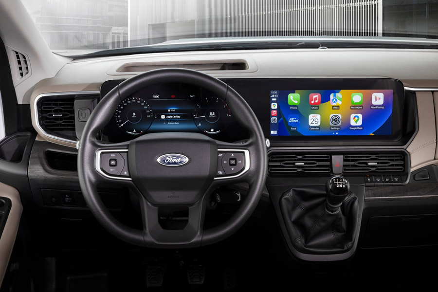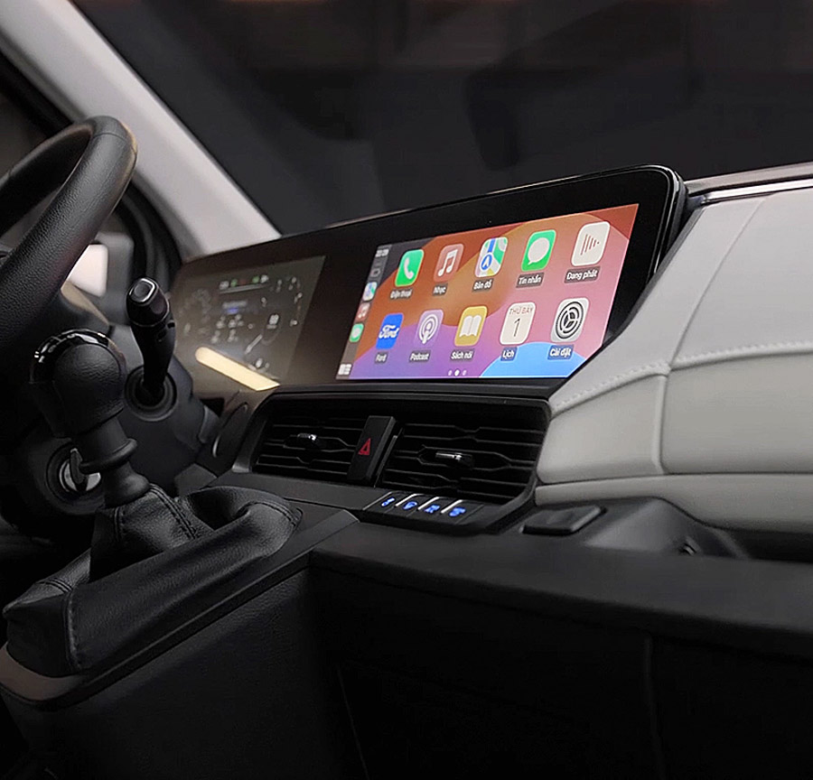 Lần đầu tiên, Ford Transit Hoàn Toàn Mới được trang bị màn hình đôi cỡ lớn, hỗ trợ kết nối không dây Apple CarPlay® và Android Auto™, cung cấp bản đồ dẫn đường, kết nối điện thoại và các tính năng giải trí phong phú.