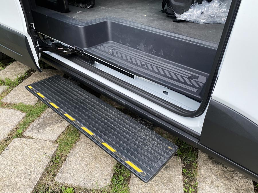 Cửa trượt của xe được thiết kế để tối đa hóa không gian khi mở, giúp hành khách dễ dàng lên xuống, ngay cả khi mang theo hành lý cồng kềnh. Các nút bấm điện từ được tích hợp tại vị trí người lái và khoang hành khách, tăng cường sự tiện lợi.