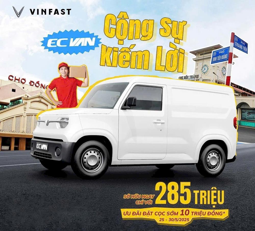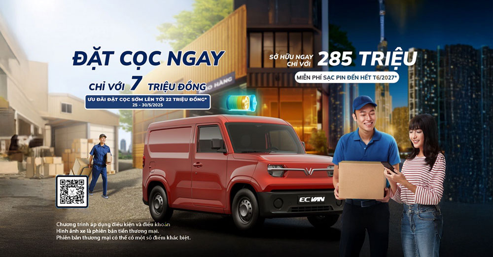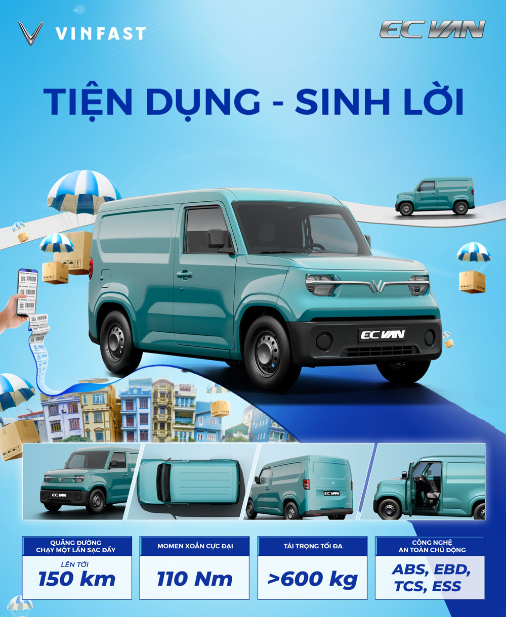 Lợi thế lớn của EC Van nằm ở chi phí vận hành cực thấp, vượt trội so với các dòng xe tải chạy xăng truyền thống, giúp tối ưu hóa ngân sách đáng kể cho người dùng. Thiết kế ngoại thất hiện đại, gọn gàng cùng 4 tùy chọn màu sắc dễ nhận diện, tạo nên ấn tượng chuyên nghiệp cho đội xe giao hàng. VinFast EC Van không chỉ là phương tiện chuyên chở mà còn là đối tác đắc lực, góp phần nâng cao hiệu quả vận hành kinh doanh hàng ngày.
