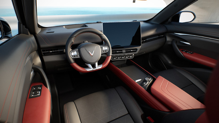 Phong cách thiết kế nội thất tối giản là chủ đạo bên trong khoang cabin của VinFast VF 7, một lựa chọn thông minh nhằm tối ưu hóa không gian và sự tiện nghi cho người dùng. Sự kết hợp độc đáo giữa hai tông màu cùng vô lăng dạng D-cut không chỉ tạo điểm nhấn sang trọng mà còn mang đến cảm giác lái thể thao và hiện đại.